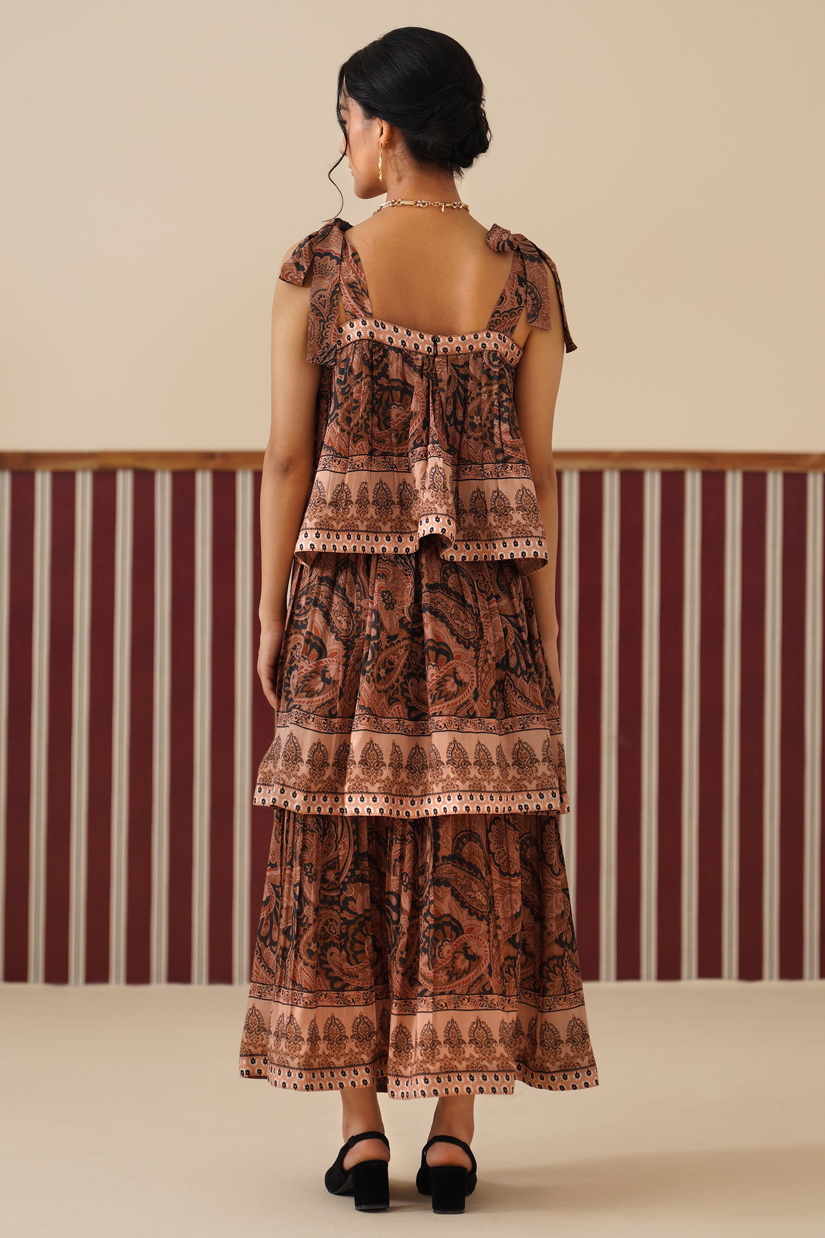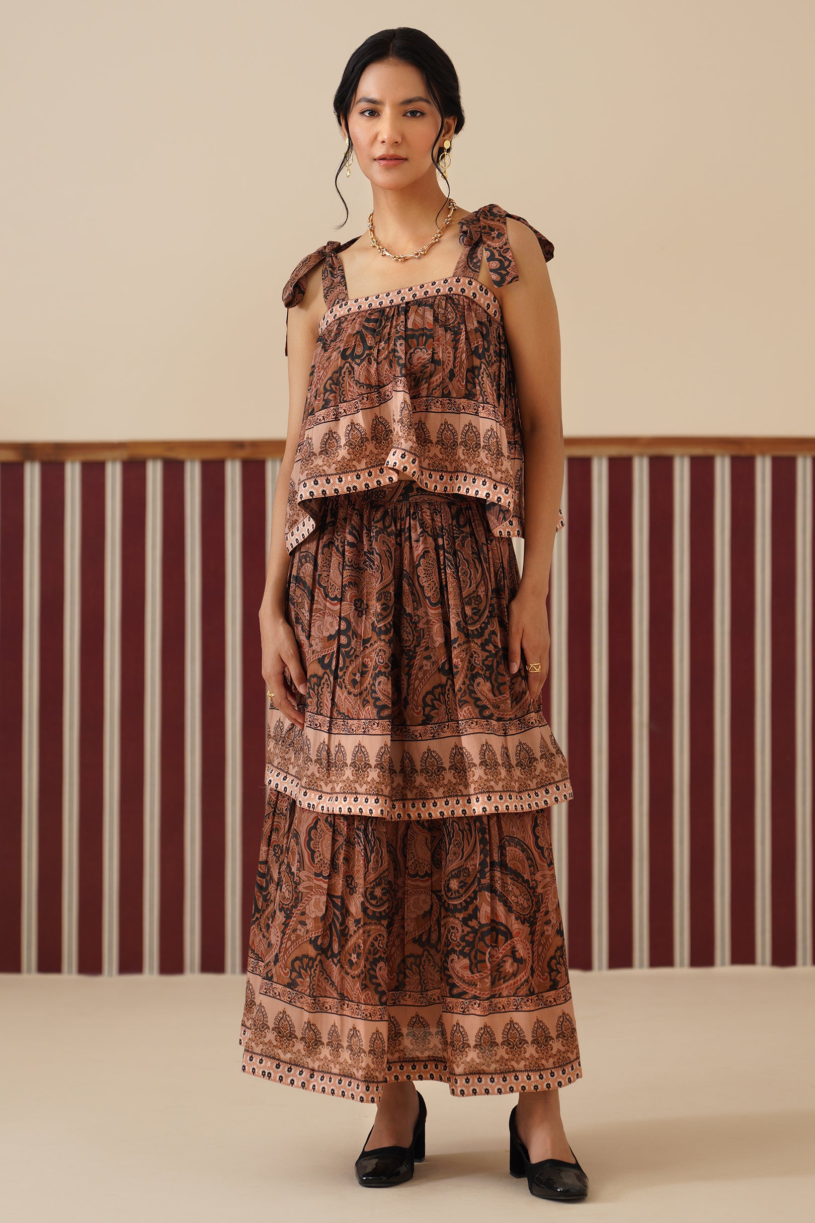 Key Phrases : paisley printed co-ord set, ruffle crop top and skirt, brown cotton summer set, tiered midi skirt outfit, self-tie strap top, boho printed co-ord, breezy two-piece set